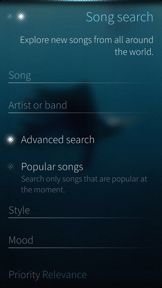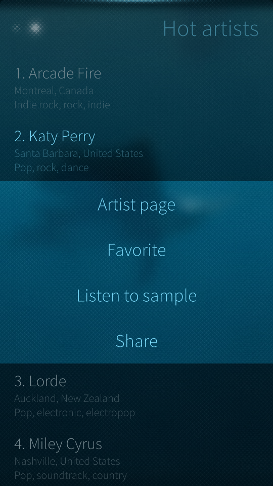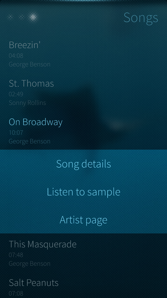 Kappaletulokset näyttävät jäljittelevän samaa designia kuin artistilistauskin, joka miellyttää ainakin omaa silmää. Esillä olevat asiat ovat aika yksiselitteisiä: Kappale, kesto ja artisti. Valikosta näyttäisi löytyvän kappaleen tiedot, ääninäyte sekä artistisivu.